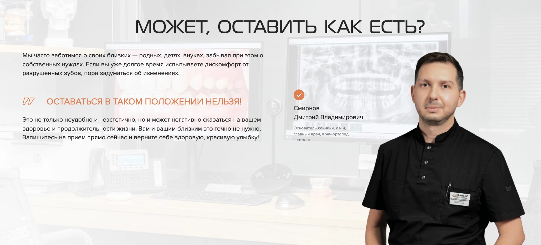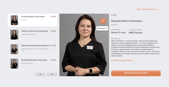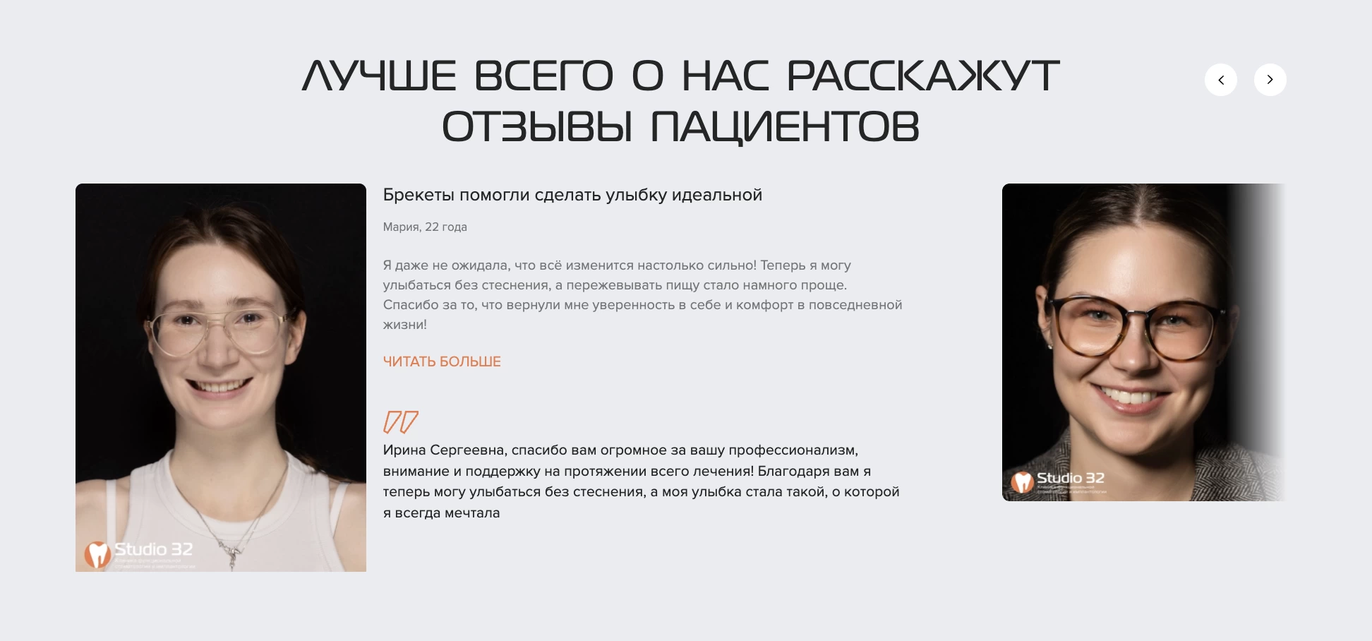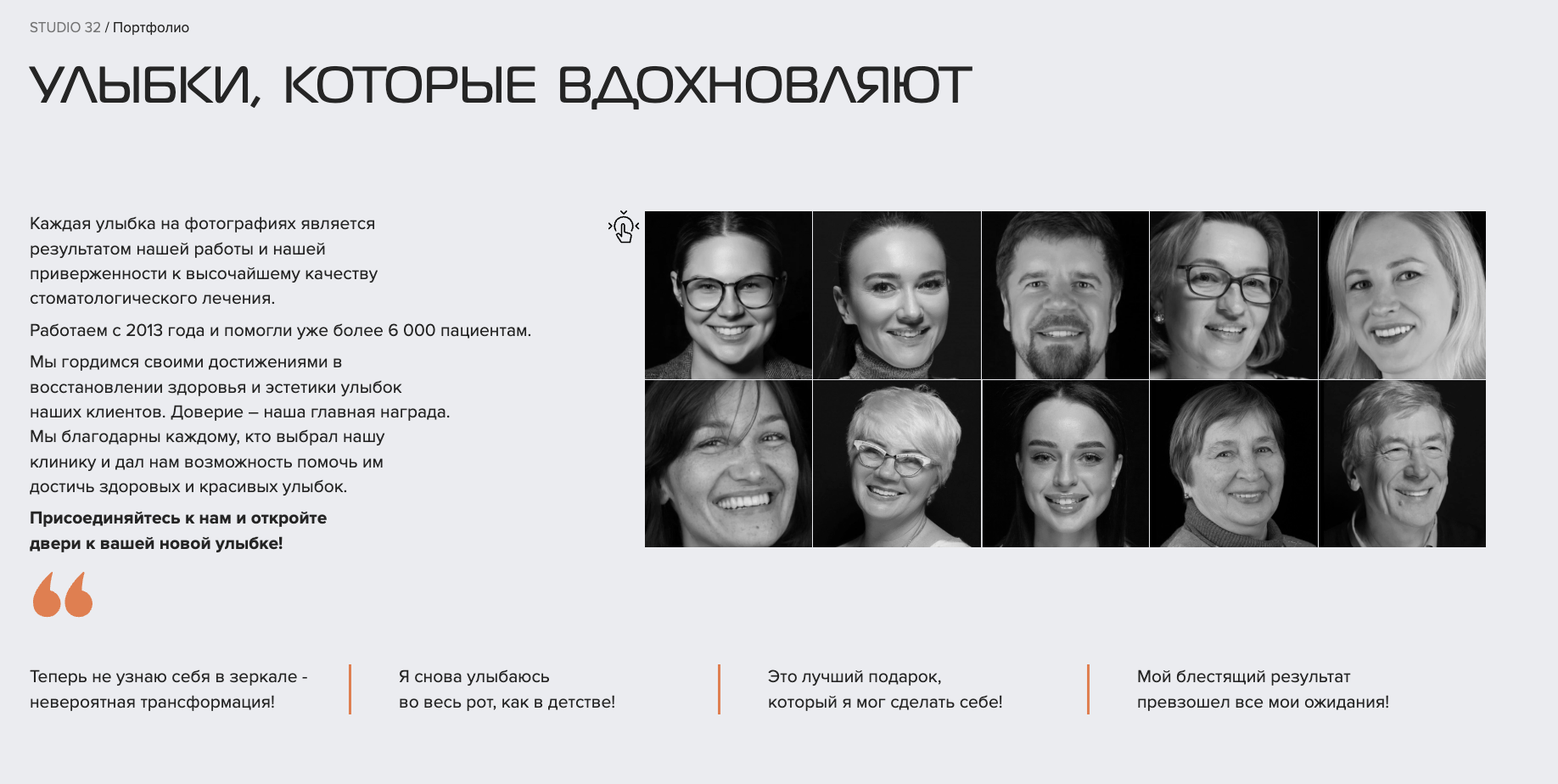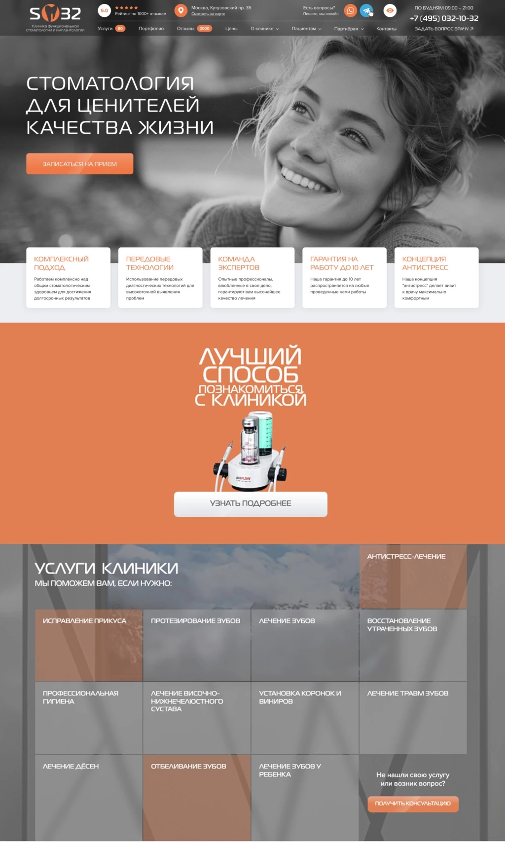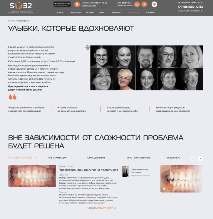 Вместо агрессивных всплывашек — несколько качественных блоков, которые ненавязчиво ведут к записи. Каждый блок визуально проработан: врач с фото и портфолио, реальные отзывы, простая форма, прозрачный прайс. Технологии показаны не списком характеристик, а через пользу для пациента. Портфолио до/после — с реальными работами клиники.