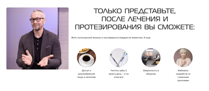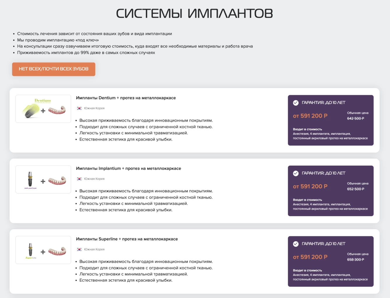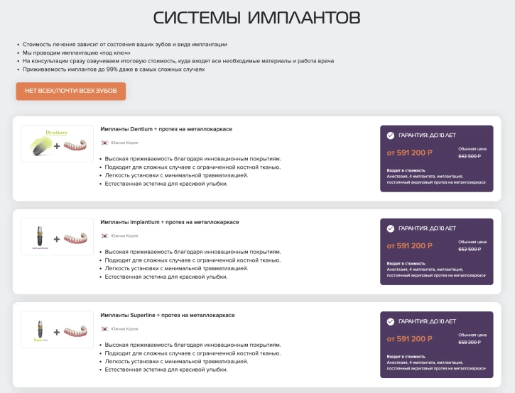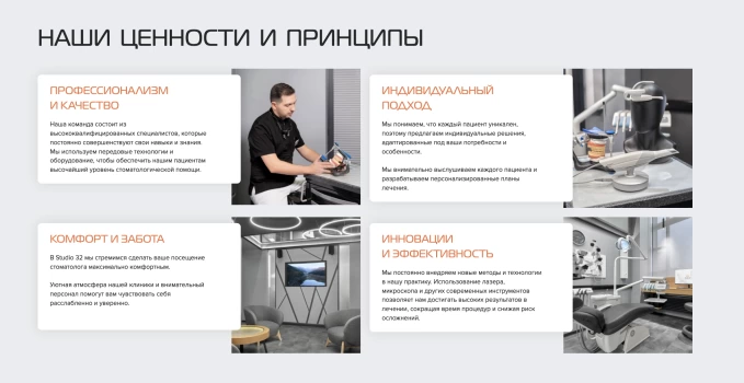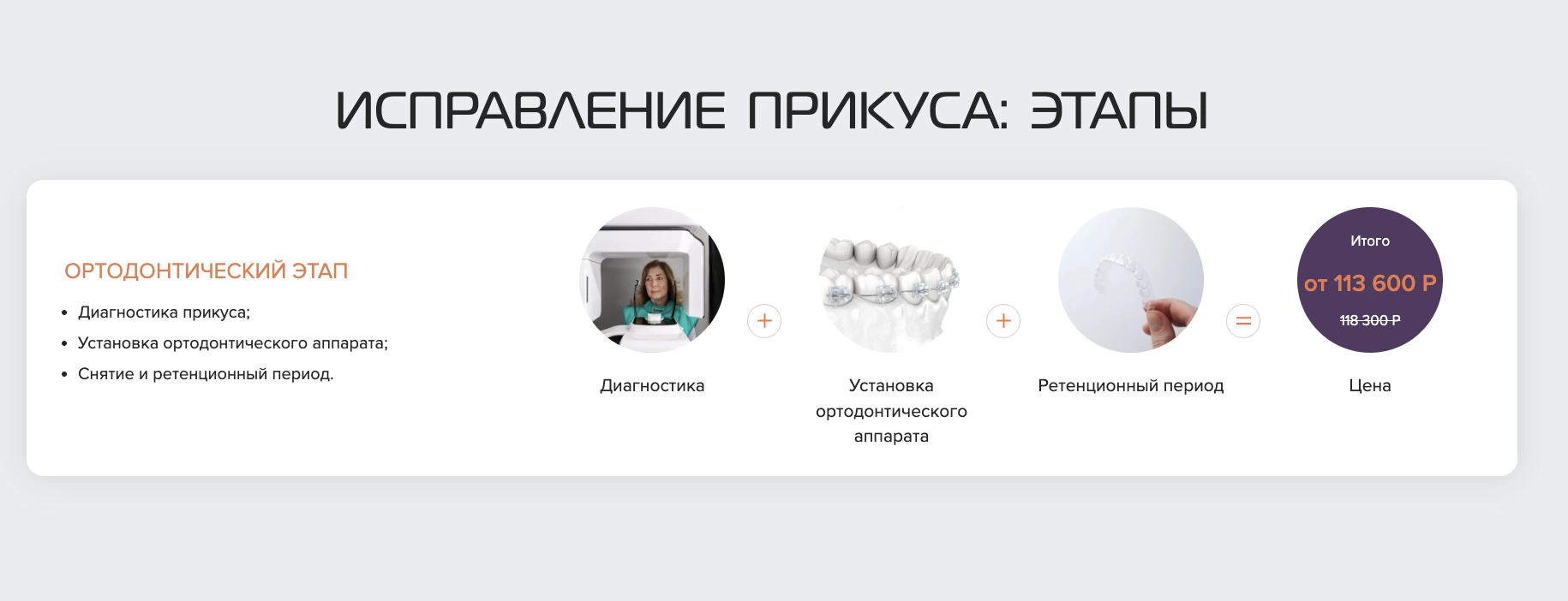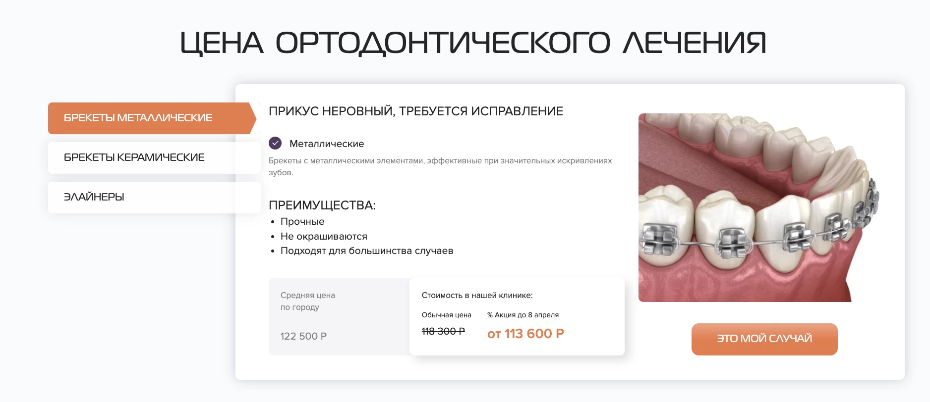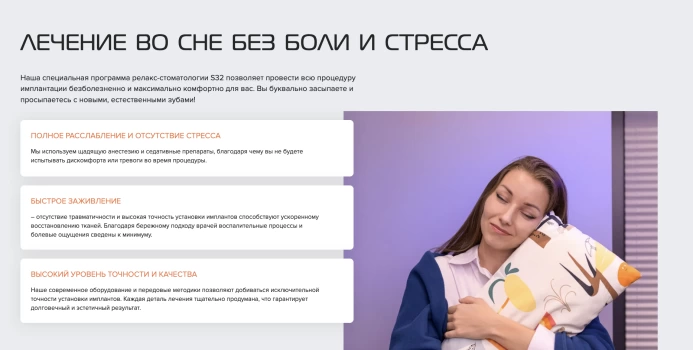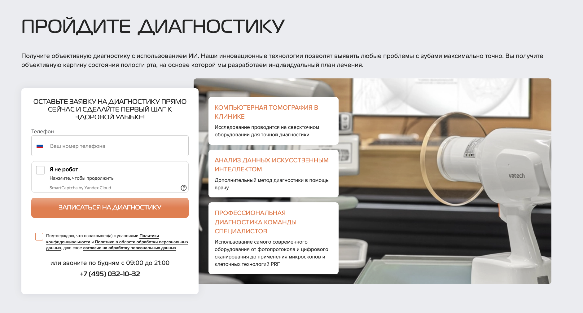 Вместо агрессивных всплывашек — несколько качественных блоков, которые ненавязчиво ведут к записи. Каждый блок визуально проработан: врач с фото и портфолио, реальные отзывы, простая форма, прозрачный прайс. Технологии показаны не списком характеристик, а через пользу для пациента. Портфолио до/после — с реальными работами клиники.