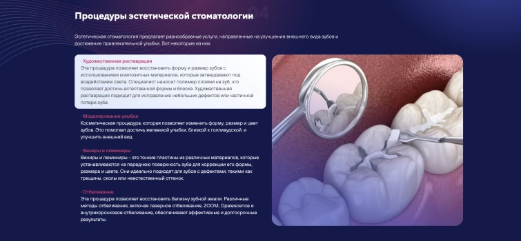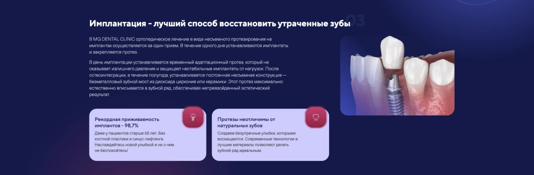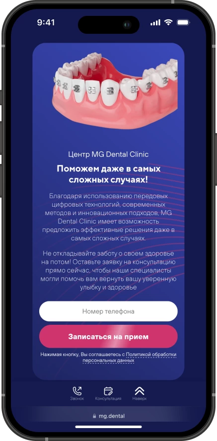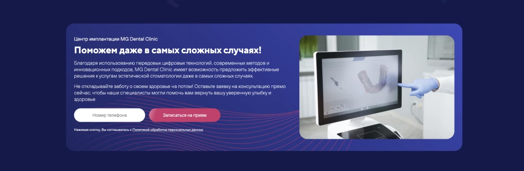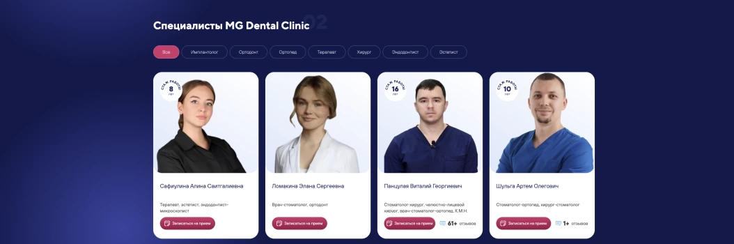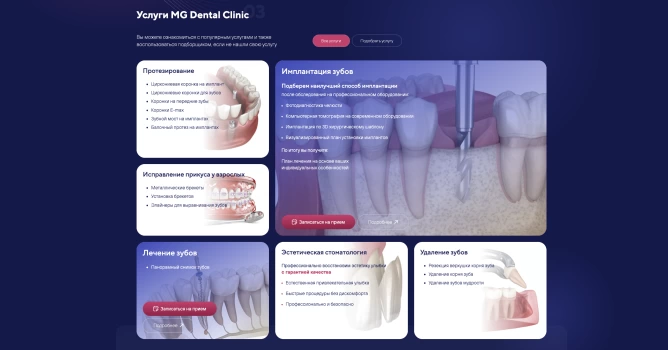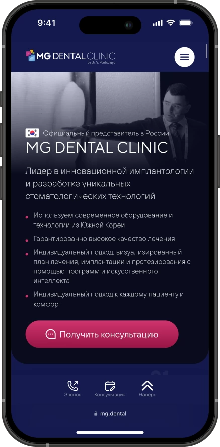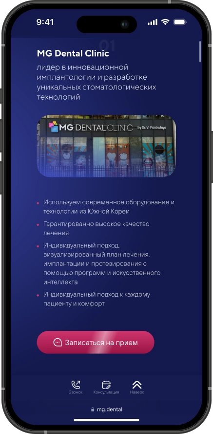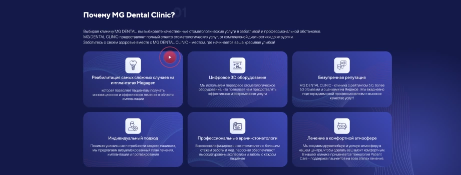 Мы не разрабатываем сайты для галочки, потому что уверены: сайты стоматологий являются один из главных элементов взаимодействия с пациентами. С их помощью выстраивается репутация, четко транслируются преимущества и ценности. Сайт MG Dental стал не просто лицом клиники в интернете, но и полноценным инструментом привлечения пациентов.