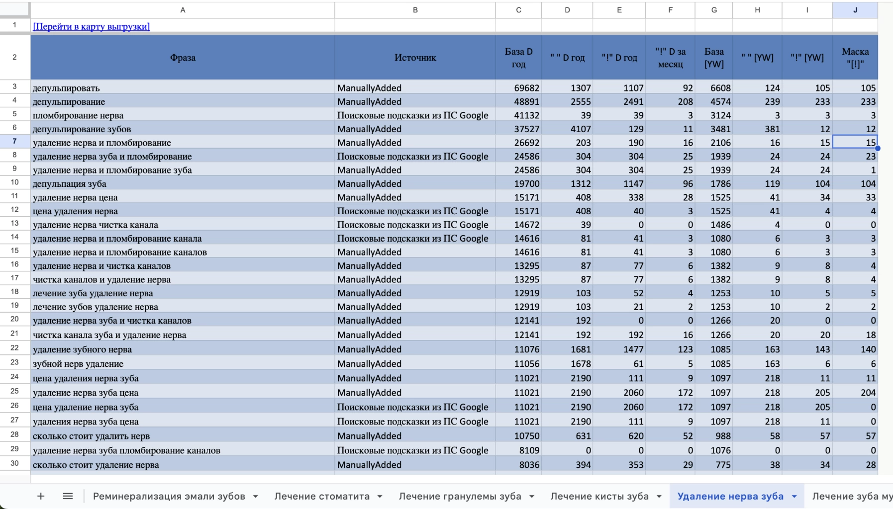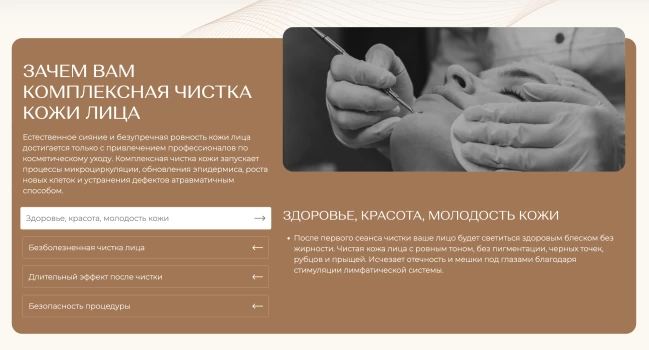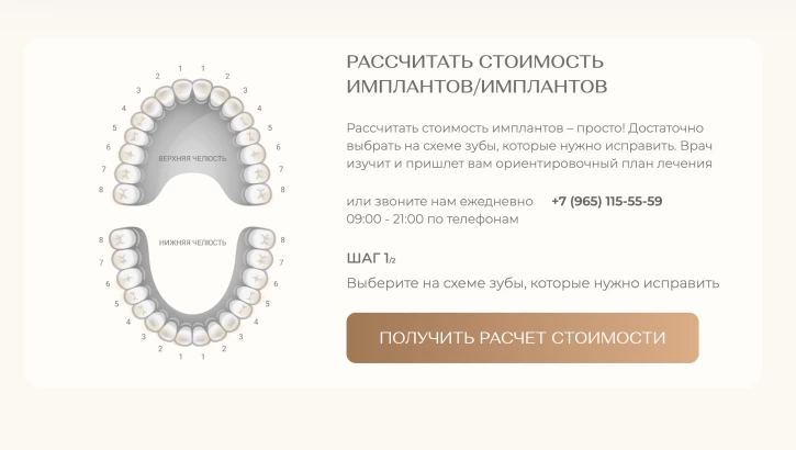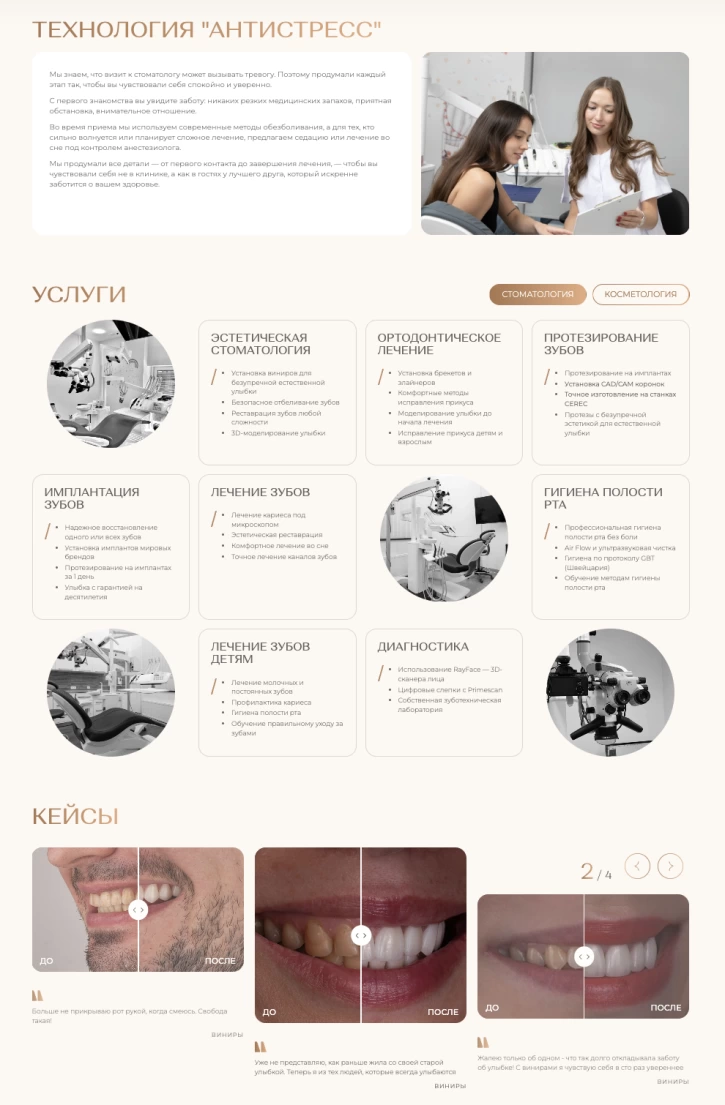 Мы собрали семантическое ядро, охватывающее стоматологию и косметологию, и на его основе выстроили SEO-структуру сайта. Только в стоматологии было выделено более 700 кластеров, а значит и посадочных страниц: имплантация, виниры всех видов, брекеты и элайнеры, ортодонтия для детей и взрослых, лечение под седацией и наркозом, детская стоматология, хирургия, гигиена, диагностика.